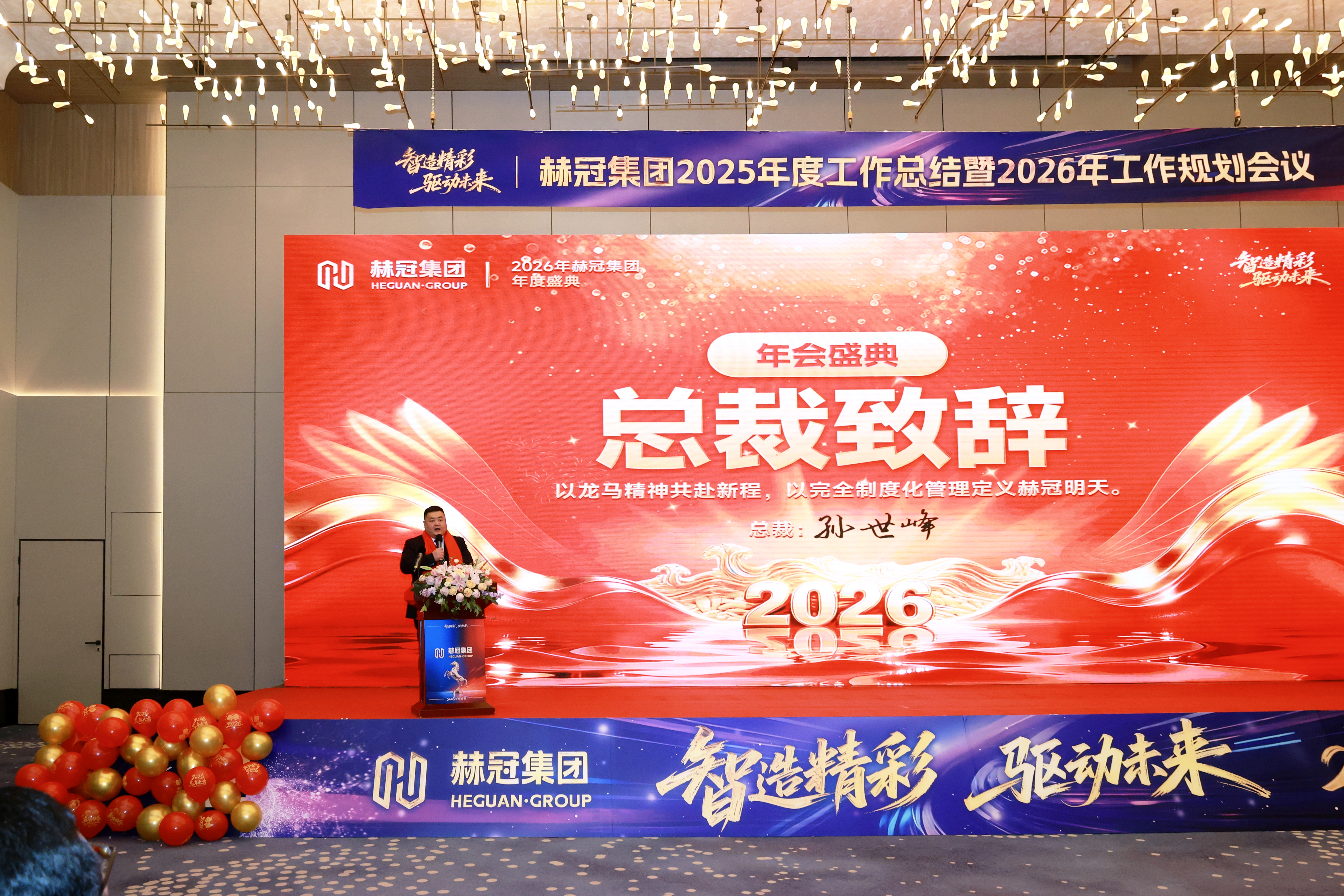 集團(tuán)總裁孫世峰先生發(fā)表重要講話。他首先代表集團(tuán)管理層,向全體員工的辛勤付出與卓越貢獻(xiàn)致以衷心感謝。孫總指出,2026年是赫冠集團(tuán)深化轉(zhuǎn)型升級(jí)、實(shí)現(xiàn)全面突破的關(guān)鍵之年。集團(tuán)將繼續(xù)弘揚(yáng)“龍馬精神”,以全面的制度化管理為抓手,堅(jiān)定不移地推動(dòng)在智能制造與可持續(xù)發(fā)展道路上的前行步伐,要求全體員工以更高的標(biāo)準(zhǔn)、更實(shí)的作風(fēng),共同迎接新挑戰(zhàn),開創(chuàng)集團(tuán)發(fā)展新局面。